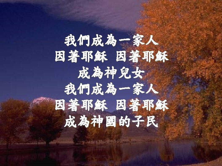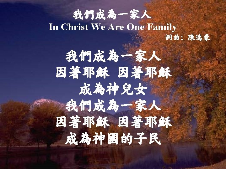 How Great Is Our God The splendor of Slides: 15 Download presentation 我神真偉大 How Great Is Our God 尊貴榮耀君王 The splendor of the King 在全地之上 clothed in majesty 願萬民都喜樂 Let all the earth rejoice 全地都喜樂 all the earth rejoice 主祢滿有榮光 He wraps Himself in light 黑暗都躲藏 and darkness tries to hide 萬民高聲唱 齊來高聲唱 And trembles at his voice 我神真偉大 How great is our God 歌頌祢聖名真偉大 sing with me How great is our God 全地都看見 all will see how great 我神真偉大 how great is our God 昔在永在君王 Age to age He stands 從今直到永遠 and time is in His hands 祢從不曾改變 Beginning and the end 永存在天地間 beginning and the end 祢是三一真神 The Godhead, three in one: 父子與聖靈 Father, Spirit, Son 真神的羔羊 The Lion and the Lamb 全能神羔羊 The Lion and the Lamb 我神真偉大 How great is our God 歌頌祢聖名真偉大 sing with me How great is our God 全地都看見 all with see how great 我神真偉大 (x 2) how great is our God (x 2) 祢至聖尊名 Name above all names 配受大讚美 worthy of all praise 全心歌頌 My heart will sing 我神真偉大 (x 2) How great is our God (x 2) 我神真偉大 How great is our God 歌頌祢聖名真偉大 sing with me How great is our God 全地都看見 all with see how great 我神真偉大 (x 2) how great is our God (x 2) 深深愛你 <1/3> Deeper In Love 深深愛你 <2/3> Deeper In Love 深深愛你 <3/3> Deeper In Love