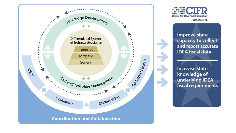 CIFR TA Engagement v On-site with key state staff v Train state staff on requirements v Analyze current and prior reports of funds made available v Assist in understanding from whom and when MFS data is/has been collected (not just the SEA!) v Ensure valid and reliable data collected and reported in current and prior years v Assist in OSEP conversations as needed/requested by state v Assist with development of written policies, procedures and practices for future MFS data collections