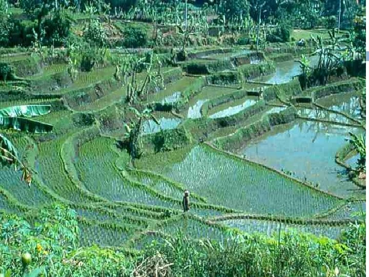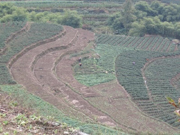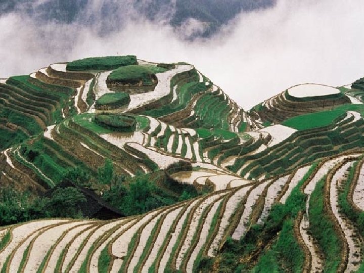 The tops of the walls act as dams as they trap water and stop the water from running down slope and they stop soil particles from moving downhill. So gully erosion is prevented as the speed of the water is reduced e. g. Rice growing areas of China, Vietnam.