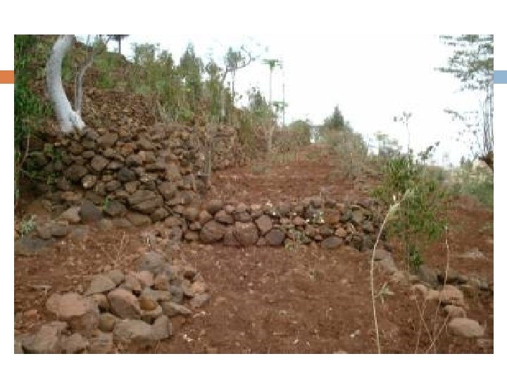 The stone walls (bunds) can also stop any soil in the water moving down slope as they act as filters and trap soil particles. They are most effective on gentle slopes.