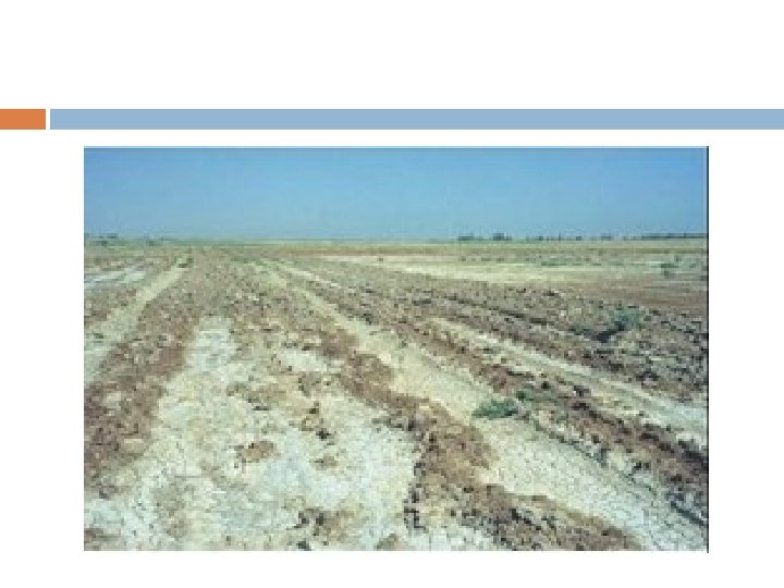 If salinisation is occurring due to irrigation the salt concentration kills plants and makes the soil surface hard and often impermeable. The soil can be blown away by wind in the dry season. To prevent this, water must be continually flushed through the system or else grow crops which require less irrigation e. g. In Australia.
