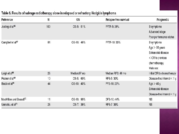 radiotherapy üradiotherapy alone at relapse is thought to be largely palliative, üthe role of combined modality therapy with the use of conventional-dose chemotherapy as part of a second-line treatment strategy has only been studied retrospectively. This type of strategy would be particularly appealing if patients have not received radiotherapy with previous treatment or have relapsed with disease in sites that have not been previously irradiated. üSalvage radiotherapy alone may be considered reasonable treatment, especially for older patients with relapsed HL who lack B symptoms, have a good performance status, and have limited stage disease at relapse.