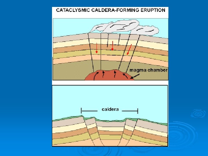 Calderas Ø A huge eruption may empty the main vent and the magma chamber beneath the volcano. Ø Mountain becomes a hollow shell and the top collapses in. Ø Huge hole left is called a caldera. Ø Example: Crater Lake, Oregon