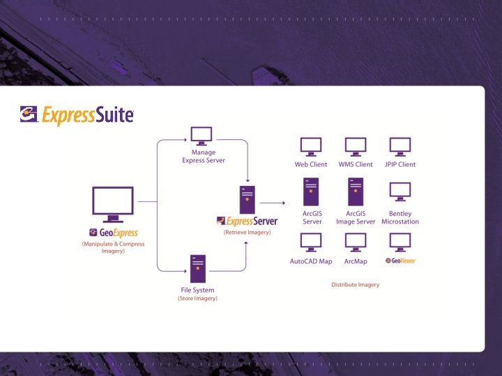 Solution • Store compressed imagery as Mr. SID/Jpeg 2000 files. • Visually lossless with a 20: 1 compression ratio. • Kept imagery in a FLAT FILE system. • Delivery service to ESRI products and other 3 rd party applications via open source OGC WMS (Web Mapping Service). • Used Lizard. Tech’s Express Server to accomplish cost savings and delivery needs.