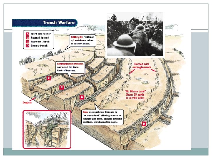 Trench Warfare Trenches were deep ditches, surrounded by barbed wire, dug by soldiers, used for protection Soldiers lived, slept, and fought from within the trenches Often spent months in the trenches, amongst dead bodies and vermin Mustard gas was a key weapon in trench warfare Soldiers developed what was called a “live and let live” system…. both sides realized they would not drive the other out and so they adhered to specific codes of conduct such as not bombing the latrines, and not attacking during breakfast. The development of trenches kept the Western Front in virtually the same positions for four years.