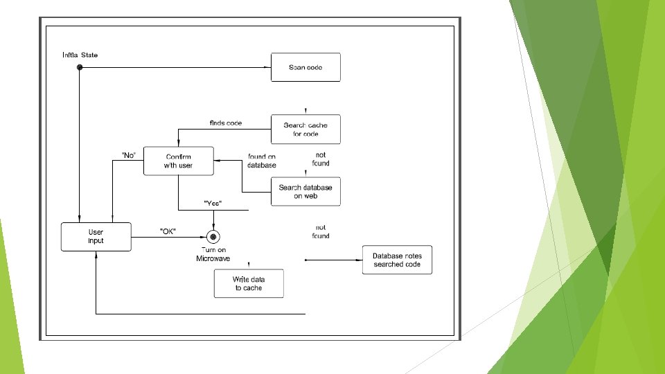User Interface Design Automatic Entry User holds item up to camera to scan barcode Video feedback provided to help with alignment Once object identified, description appears on screen Start to commence cooking Override to customize cooking instructions