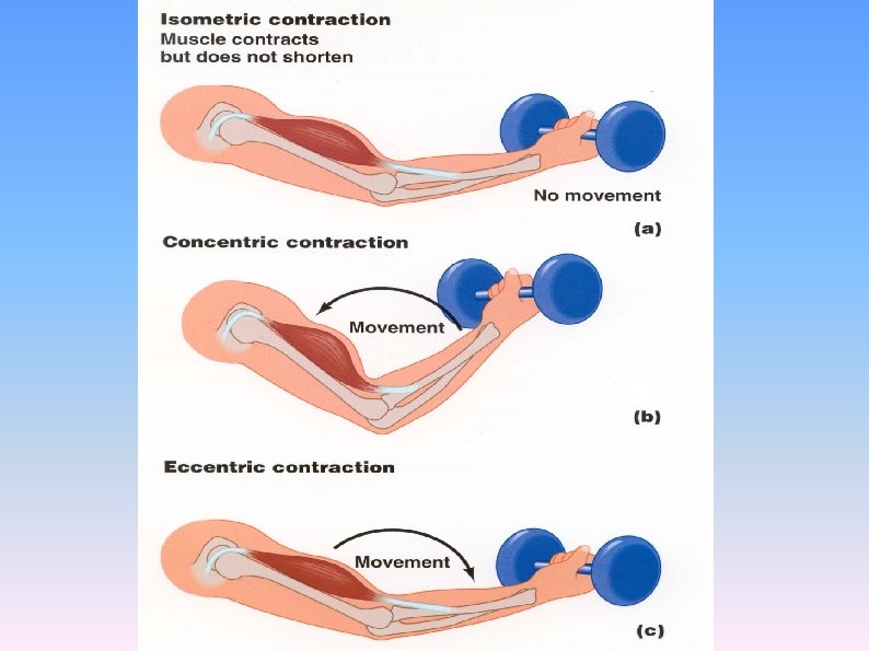 Types of Muscle Contraction - 3 different types of muscle contractions - The term contraction does not necessarily mean that the muscle has shortened, but rather that tension has been generated 1. Concentric: occurs when muscle fibres shorten 1. - example: the biceps shorten when lifting an object 2. Eccentric: occurs when the muscle fibres lengthen 3. - the biceps lengthens as the same weight is placed back on the ground 4. 3. Isometric: occurs when the muscle fibres do not change in length 1. - when you try to lift an immovable object