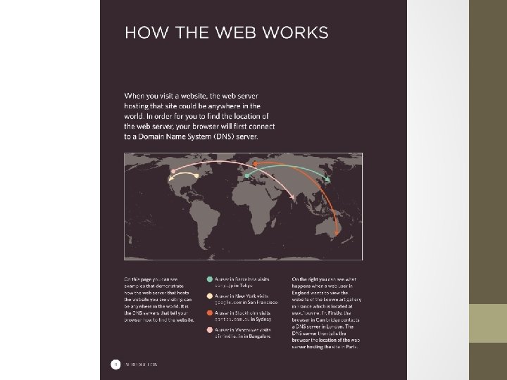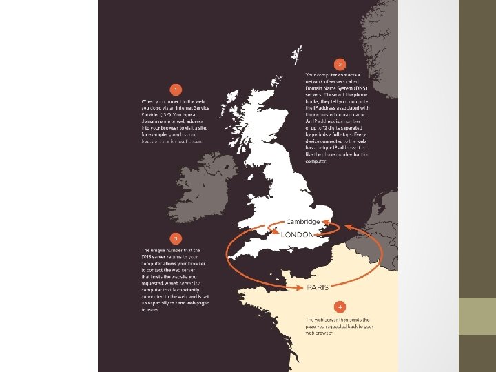 Browsers • People access websites using software called a web browser. Popular examples include Firefox, Internet Explorer, Safari, Chrome, and Opera. • In order to view a web page, users might type a web address into their browser, follow a link from another site, or use a bookmark.