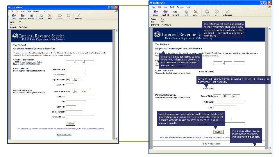 Phishing – Link Manipulation n Most methods of phishing use some form of technical deception designed to make a link in an email (and the spoofed website it leads to) appear to belong to the spoofed organization. Misspelled URLs (Uniform resource locator ) or the use of subdomains are common tricks used by phishers, such as this example URL, http: //www. Suntrust. com. bank. com/. Another common trick is to make the anchor text for a link appear to be a valid URL when the link actually goes to the phishers' site.