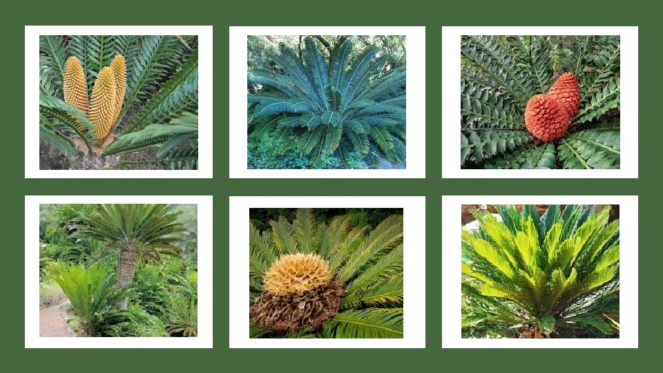 Cycads The 220 species of the non-flowering cycads are found in the tropics. Most of them look like ferns, having a cluster of long fronds growing from a central stalk but they have male and female cones containing seeds. Cycads appeared in the fossil record about 230 million years ago.