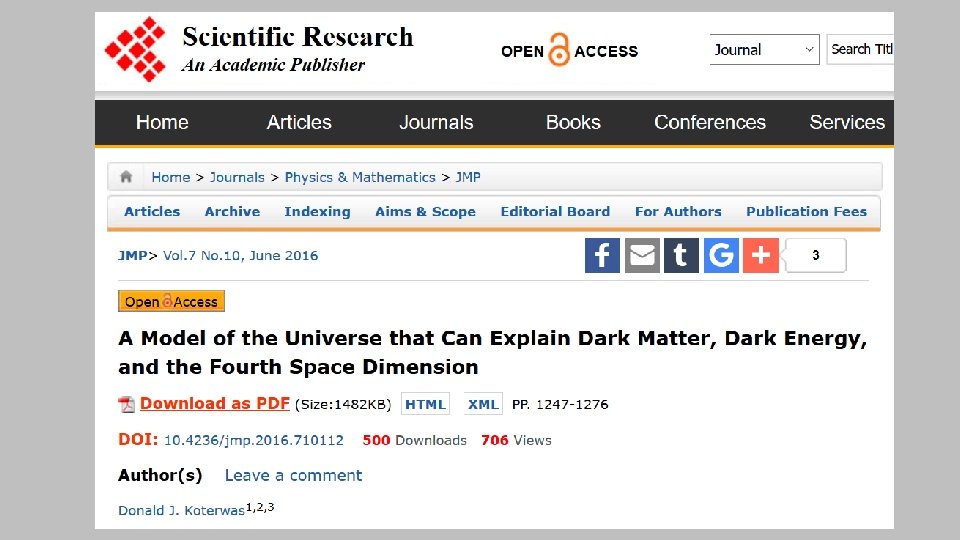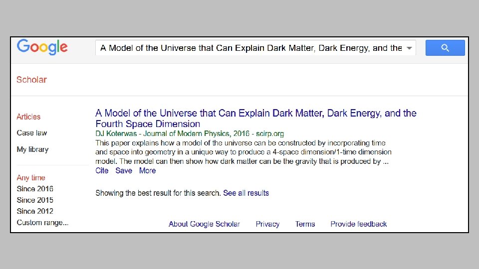 Conclusion • The author-pays model is a major cultural change in scholarly publishing that has led to the creation of many scams • We have given up on selectivity in scholarly publishing • Predatory journals threaten the integrity of science • Scholarly authors are now consumers of publishing services, but there's no organization that looks out for their interests • The scientific consensus is that we don’t know the nature of dark matter and energy, yet articles in predatory journals say we do