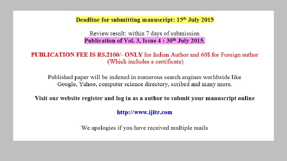 Publishing models for scholarly journals • Traditional (subscription) model • Hybrid open-access • Platinum open-access = free to author, free to reader • Delayed open access = subscription model but OA after some time • Gold open access = free to reader, author pays a fee
