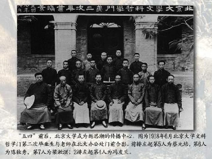 Cai Yuan-pei & National University of Peking • Cai Yuan-pei (蔡元培) became Chancellor of the National University of Peking (Peita) in 1916. • It was a corrupt and conservative institution. Professors were mostly government officials and a degree was seen as a stepping stone into officialdom. • Cai worked immediately to turn the university into an efficient and forward thinking institution.