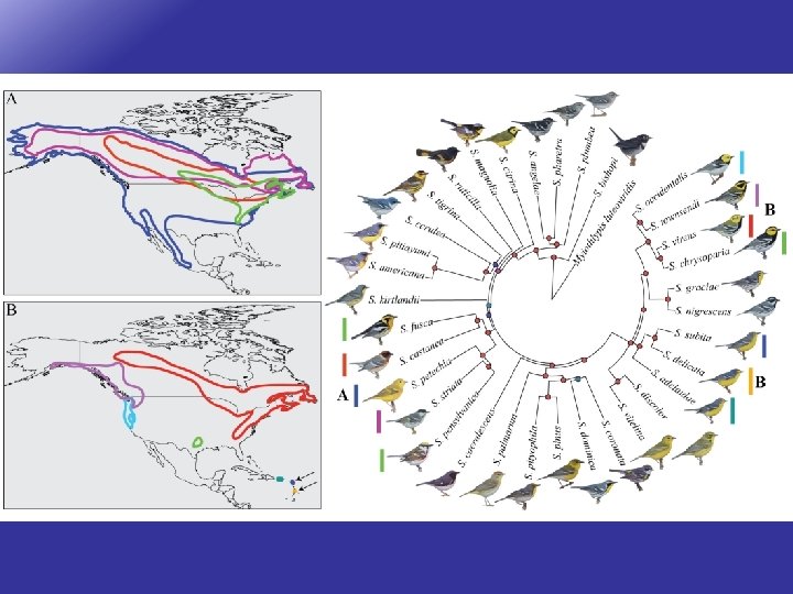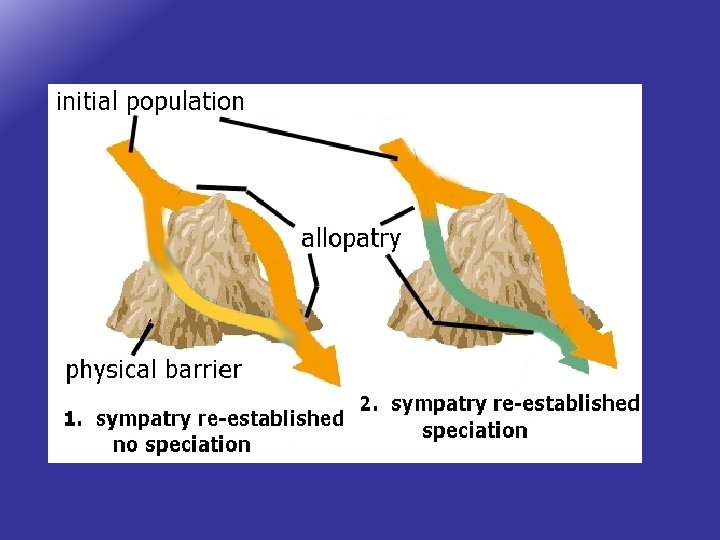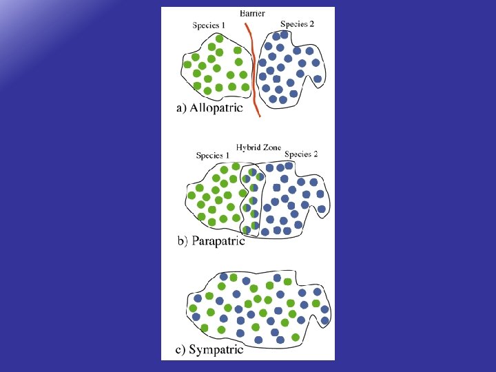 Parapatric Speciation • distinct species with a contact zone between populations where some hybridization may occur. • They remain distinct due to sexual selection and different selection pressures