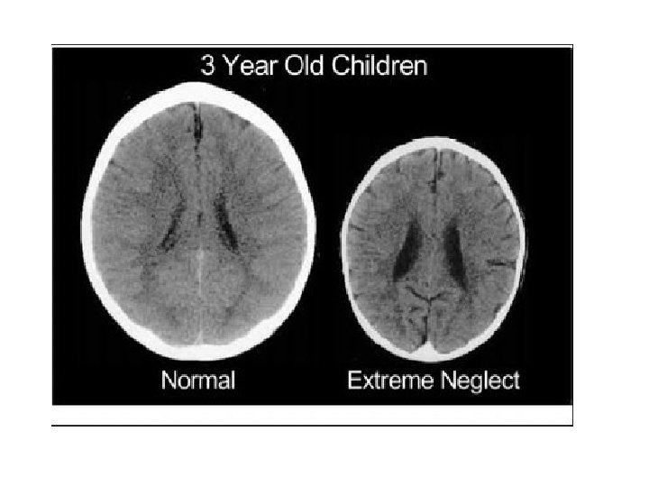 The outcomes of neglect • According to Bruce Perry, institutionalized and neglected children tend to show low IQs, developmental delays and small head size. • This developmental trend is reversed when children are placed in good foster homes or adopted, younger children making better progress than older ones. • Perry’s investigation of head size leads him to conclude that neglect results in impaired brain development and he supports this conclusion by referring to evidence from brain scans. • “Childhood Experience and the Expression of Genetic Potential: What Childhood Neglect Tells Us About Nature and Nurture”.