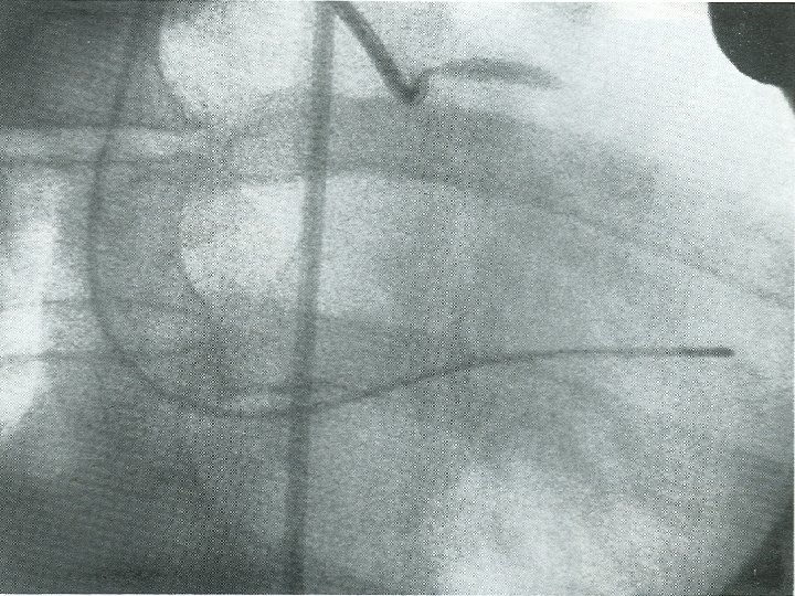 The first coronary angioplasties in Zurich • Stiff wire with a C-shaped tip introduced through a plastic catheter (arrow) into the leg artery of a dog