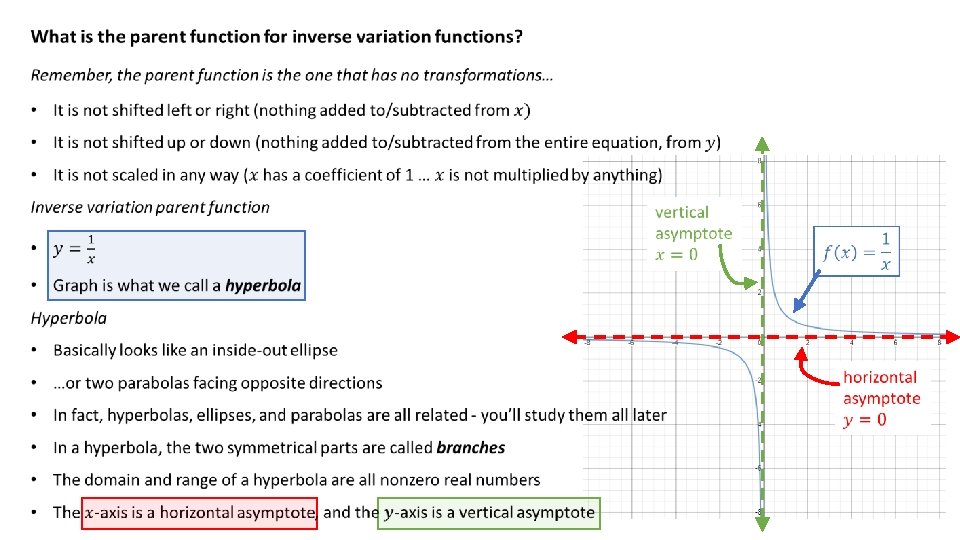 How would we graph the inverse variation parent function? Just like we would any other function… 1. Create a table of values • Trick is picking “good” values • For this, pick positive and negative numbers around zero x y 2. Plot the points • Draw the graph (don’t forget to label axes & use arrow heads!) • Then the points themselves 3. Connect the dots! 1 2 3