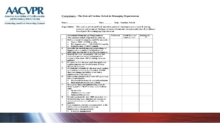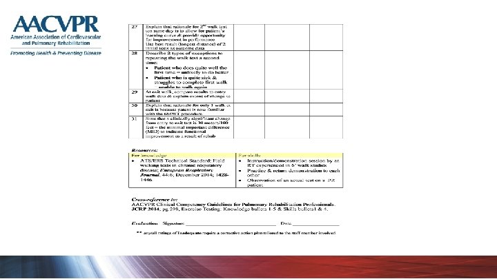 WHY Staff Competencies Intrinsic Philosophy = desire for continuous learning to be the best rehab practitioner you can be Extrinsic Expectation: • Hospital requirement • Joint Commission standard • AACVPR Program Certification criteria