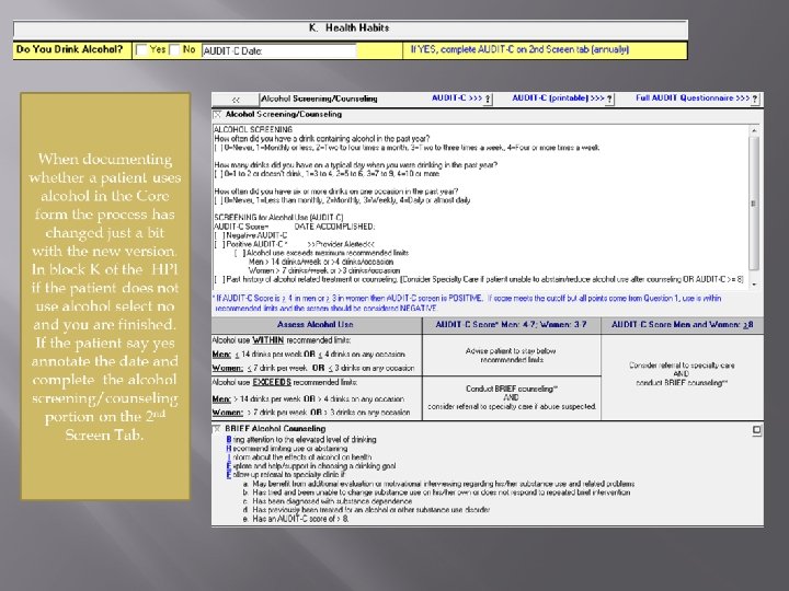 If patient states they do drink alcohol you need to fill out the Alcohol Screening/Counseling (2 nd screen tab) Ask the questions/add up the score. Be sure to document score and date accomplished
