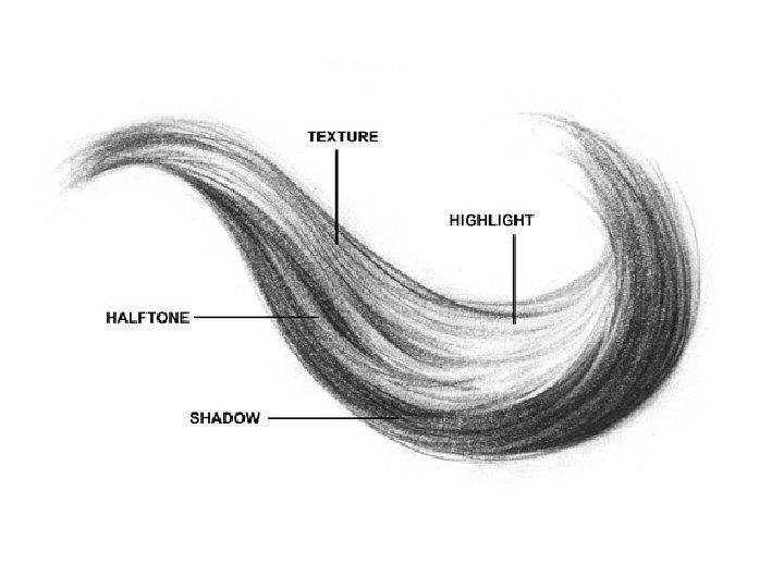 Texture • Some tips when drawing the hair texture: • Get the illusion of the strands. Don’t try to draw every single strand. • Have confidence with every stroke. It’s better to draw a quick confident strand slightly out of place, then a wobbly stroke in the right place. Don’t be timid. This happens when drawing strands that drop down the forehead. People don’t want to mess up the face. But, it doesn’t matter if it’s in the perfect spot… Hair moves. • Start the stroke at the root and let it taper towards the tip. • Generally, lines should be lighter and thinner at the highlights. • If working with graphite, use a combination of softer duller pencils and harder sharp pencils. For example a dull 4 B for larger soft gradations and a sharp HB for more defined shapes. Watch out - sometimes a pencil that is too soft will cause the texture of the paper to show through. This ruins the illusion of hair texture, since hair texture is made of long flowing lines and paper texture is usually small repetitive dots.