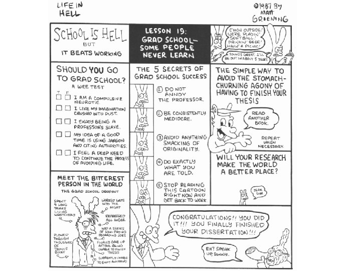 FAQ • How long does graduate school take? – Depends: most masters take about 2 -3 years and Ph. D. takes typically between 4 -7 years • How expensive is it? – Graduate school is very expensive, but good graduate schools should provide you with some kind of financial assistance. Ph. D students usually get tuition waivers and part-time jobs as research assistants. They also often have opportunities to teach undergraduate courses in the summer or during the school year. Masters students are sometimes also allowed to teach for pay, and sometimes they are able to fulfill other office or research work for the department, but in general, masters students usually don't get much financial assistance. Psy. D students don't usually get much assistance either. Furthermore, when you're thinking about your financial situation in graduate school, keep in mind the cost of living in the area your program is located makes a huge difference. • Can I get in? – Here are some very general guidelines about grades: all else being equal, students who have above a 3. 4 can expect to be admitted to some Psy. D or Ph. D programs; students who have above a 3. 0 can expect to be admitted to some very respectable Masters programs and even some Psy. D programs; students who have a GPA above 2. 8 can expect to be admitted to some Masters programs.