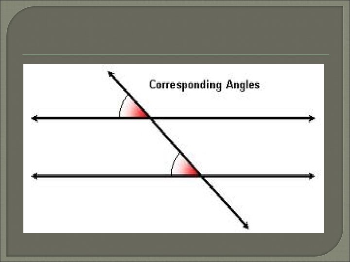 How to identify pairs of lines and special angles formed by two lines and a transversal? Corresponding Angles Two angles that occupy corresponding position Angle measures are CONGRUENT Corresponding: same