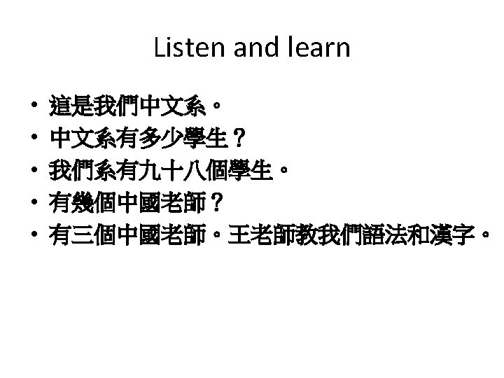 Objectives of this lesson: • Learn to talk about our department and your study of Chinese • Learn to respond to compliment • Learn the numbers and measure words in Chinese