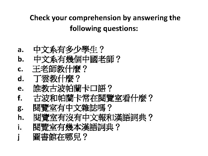 Be paired. Ask and answer the following questions. a. Zhōngwén xì yǒu duōshǎo (how many) xuésheng? b. Zhōngwén xì yǒu jǐ ge (how many) Zhōngguó lǎoshī? c. Xiè lǎoshī jiāo nǐmen shénme? d. Nǐmen zài Zhōngwén xì xuéxí shénme? e. Nǐmen xuéxiào yǒu túshūguǎn hé yuèlǎnshì ma? f. Túshūguǎn yǒu méiyǒu Zhōngwén shū, Zhōngwén bà o? Hànyǔ cídiǎn ne? g. Nǐmen cháng zài túshūguǎn kàn shū, xuéxí ma?
