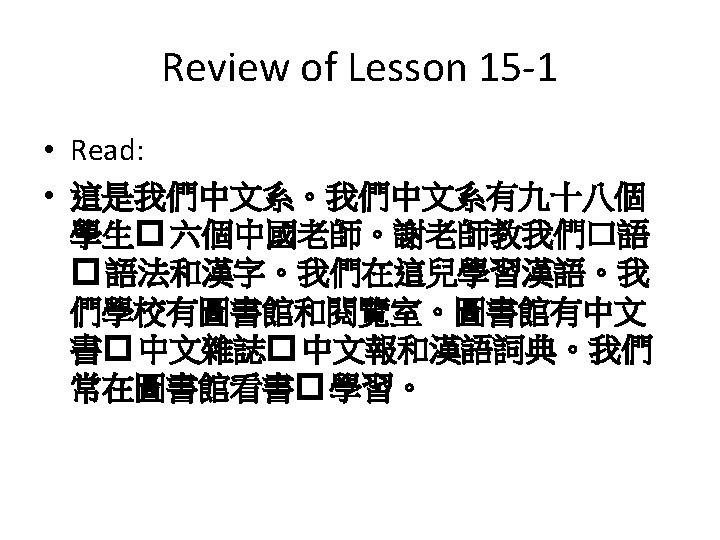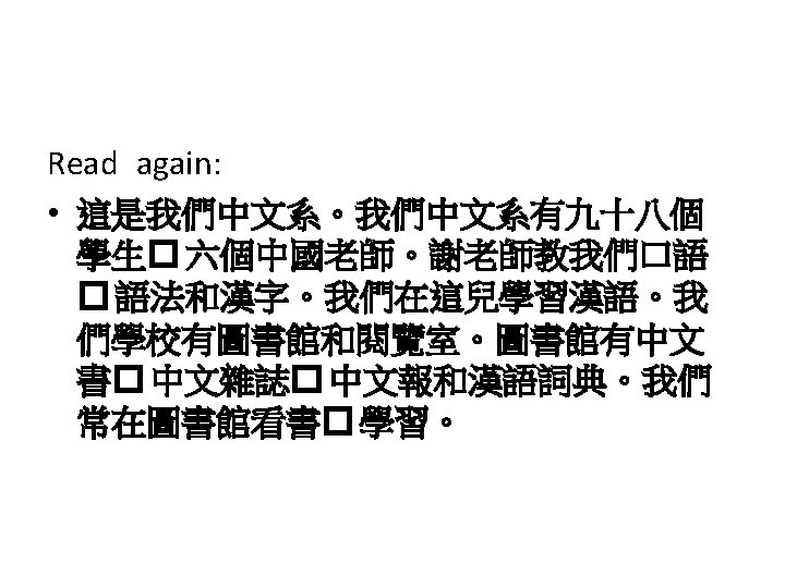 Retelling • Try to retell the passage using your own words. The following key words may help you: • 這是…… • 中文系有…… • ……在 這兒…… • 我們學校有…… • 圖書館有…… • …. . 常在……