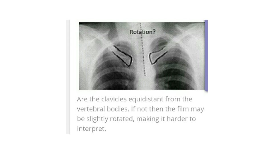 • Initial checks 1. Check the patients name 2. Look up the patients history 3. Read the date of the radiograph. 4. Look for markers 5. Position the postro -anterior and lateral view 6. Antro -posterior views taken in certain circumstances. 7. Check for any instrument insertions • film quality 1. Is it taken under full inspiration ? U should be able to see 10 posterior ribs and 6 anterior ribs. 2. Check for rotation