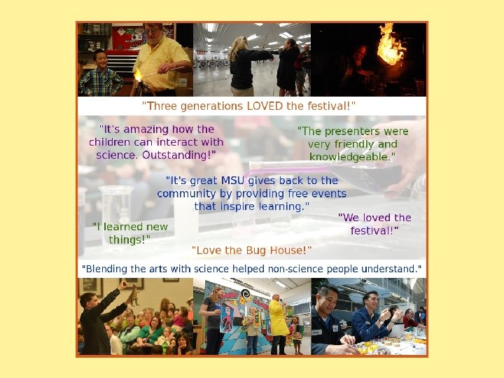 Presenting at a Festival • Plenty of volunteers, working in shifts • Big idea can be presented in <5 minutes – Focus on the key message, why it’s exciting – Keep it simple, connect to relatable experience • Offer opportunities to dig deeper – Poster (light on text), further reading, next steps – Handout with website – Materials targeting teachers, students, public? • Hands-on, active • Accessible to all ages