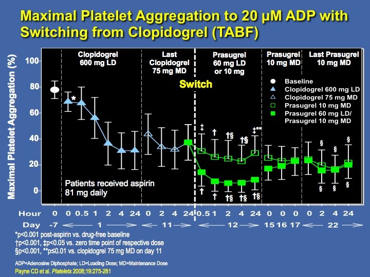 SWAP Results: MPA at Various Time Points Following Loading Dose of Study Drug 20 µM ADP Mean ± SD ADP=Adenosine Diphosphate; LD=Loading Dose; MD=Maintenance Dose; MPA=Maximal Platelet Aggregation; SD=Standard Deviation *p < 0. 0001 vs clopidogrel 75 mg MD; †p < 0. 0001 vs prasugrel 10 mg MD Angiolillo DJ et al. JACC 2010; 56: 1017 -1023