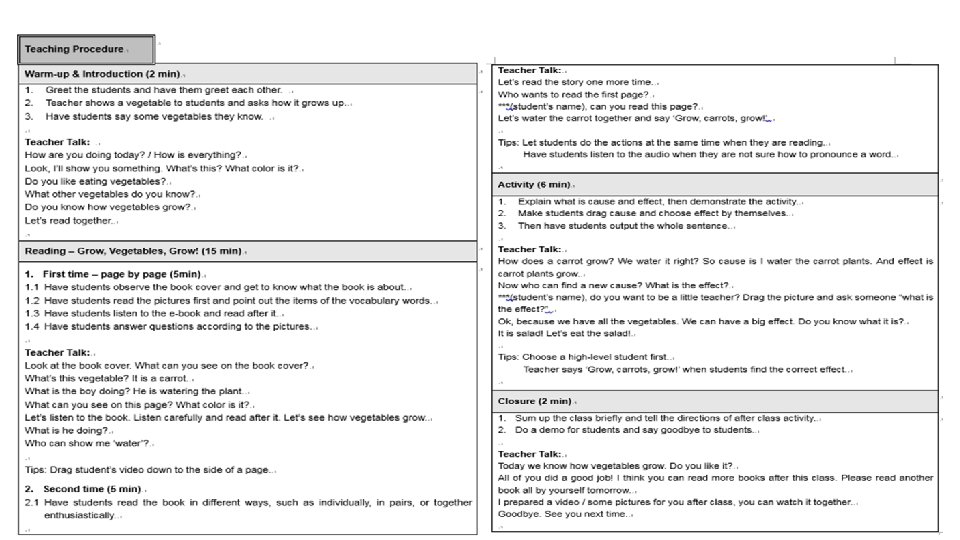 2. Interactive Learning G Level 1. Talk about the book cover and the book’s name. 2. Talk about the picture and key vocabulary words, play audio, have students read after the audio. 3. Independent reading with teacher’s help. 1. Talk about the book cover and the book’s name, writer and illustrator. Predict what the book is about. 2. Talk about the picture , key vocabulary words and sentences, play audio, (have students read after the audio ). 3. Independent reading with teacher’s help.