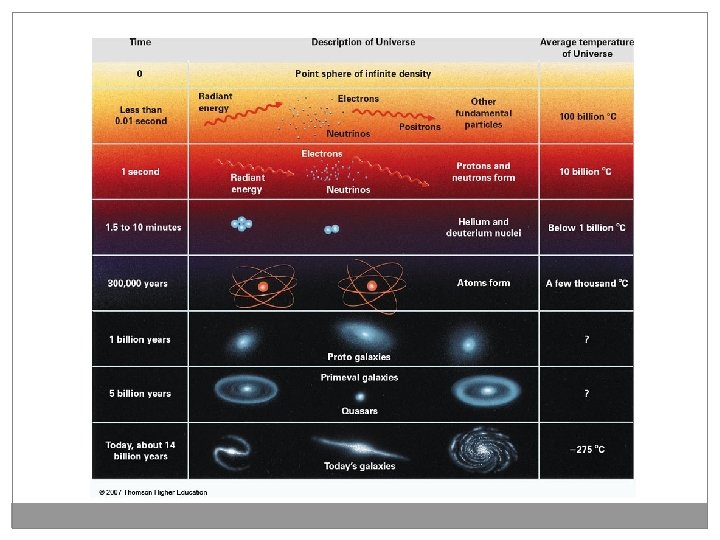 Big Bang Theory n n 13. 7 billion years ago Creation of all matter Hydrogen and Helium the first More complex elements evolved through time