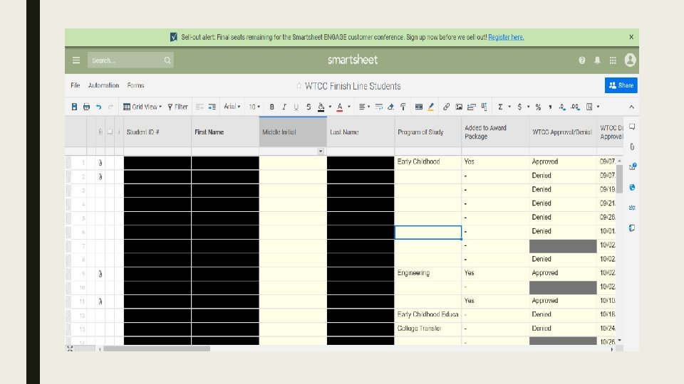 Collaboration Methods ■ Utilization of Smartsheet as a tool to keep track of student progressions ■ Held meetings to discuss ways to provide outreach to students – Vice President – Financial Aid Office – Registrar’s Office – Continuing Education – Communications – Program Manager and One-Stop System Director