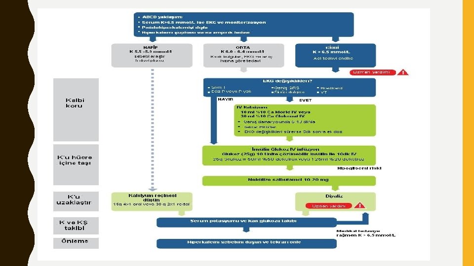 • Iv kalsiyum antagonizasyonu membran potansiyel • insulin-dextroz infüzyonu • Na-HCO 3 - hücre dışından hücre içine transfer • B 2 adrenerjik ajanlar • Hemodiyaliz • Gastrointestinal katyon değiştirici ajanlar • Diüretikler vücuttan uzaklaştırma