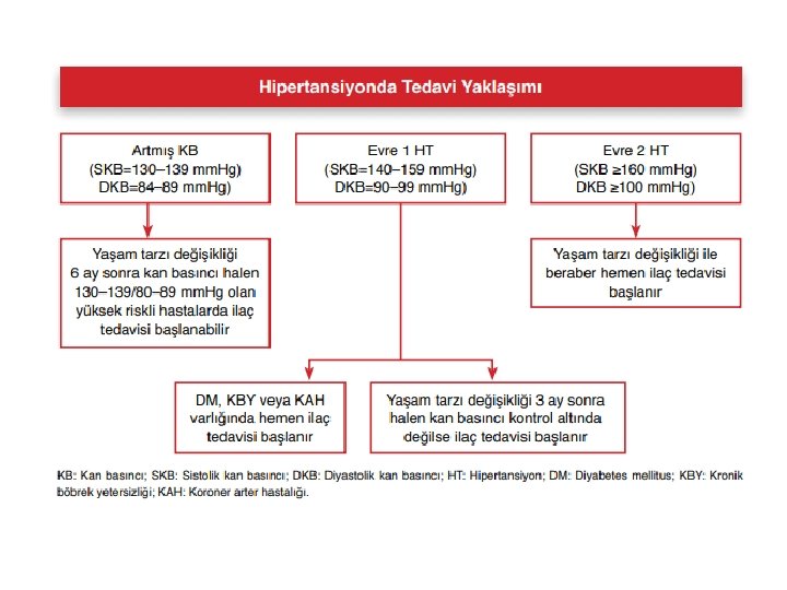 TEDAVİ Yaşam tarzı değişiklikleri • Toplum sağlığı açısından erişkin bireyin kan basıncı hangi evrede olursa olsun uygun yaşam tarzı değişiklikleri önerilmelidir. • Eğer bireyin kan basıncı artmış ise (sistolik 120 – 139 mm. Hg, diyastolik 80– 89 mm. Hg) bu öneriler ısrarla vurgulanmalıdır. • Hasta hipertansif ise yaşam tarzı değişikliği önerileri mutlaka uygulanmalıdır.