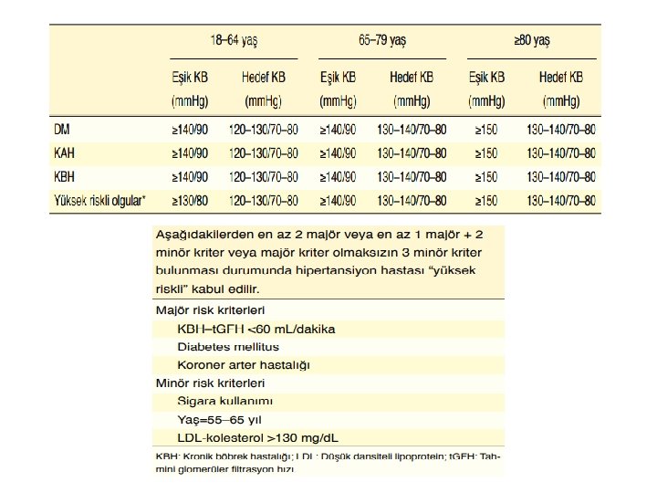 • 2) Dirençli hipertansiyonu olan hastalar: Biri diüretik olmak üzere üç farklı sınıfta antihipertansif ilacı yeterli dozda kullanmasına rağmen kan basıncı kontrol altına alınamayan hastalar • 3) Antihipertansif tedavi altındayken kan basıncı kontrolü aniden bozulan hastalar • 4) Otuz yaşından önce hipertansiyon tanısı alan hastalar