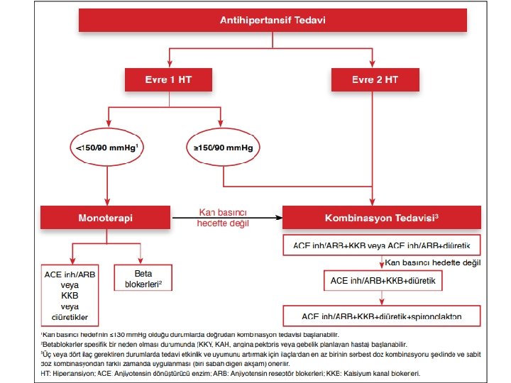 • Antihipertansif tedaviye tek ilaçla veya kombinasyon ile başlanabilir. Tek ilaçla başlanması durumunda kan basıncı hedef düzeye gelmezse kombinasyon tedavisine geçilir. • Kombinasyon tedavisinde ilk basamakta ACE inhibitörleri/ARB+KKB veya ACE inhibitörleri/ARB+diüretik tercih edilmesi önerilir. • Eğer bu kombinasyon ile kan basıncı kontrol altına alınamazsa ACE inhibitörleri/ARB+KKB+diüretik kombinasyonuna geçilir. • Üçlü kombinasyonla da kan basıncı kontrol altında değilse tedaviye mineralokortikoid reseptör antagonistinin eklenmesi düşünülmelidir.