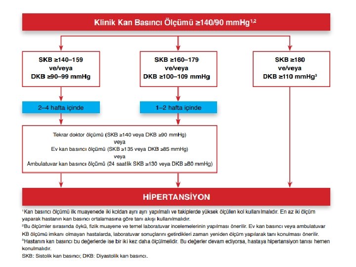 • Türk hipertansiyon uzlaşı raporu 2019’a göre sistolik kan basıncının ≥ 140 mm. Hg ve/veya diyastolik kan basıncının ≥ 90 mm. Hg olması hipertansiyon olarak tanımlanır. • Sistolik kan basıncı özellikle önemlidir ve çoğu hastada tanıda esastır.