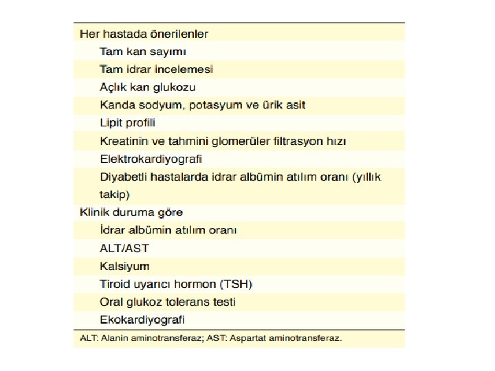 Laboratuvar İncelemeleri • Kardiyovasküler riski, hedef organ hasarını ve sekonder hipertansiyonu araştırmak ve değerlendirmek amacıyla her hastada, bazı temel laboratuvar incelemelerinin yapılması gereklidir.