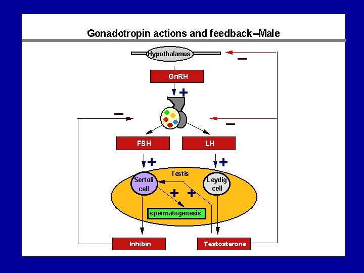 FSH VE LH’nin testisler üzerindeki etkileri • FSH; seminifer tübülusları etkileyerek • • spermatozoidlerin oluşumunu düzenler, Sertoli hücrelerinde andorejen bağlayıcı protein ve inhibin sentez ve salgılanmasını uyarır. LH, leydig hücrelerinde (=interstisiyel hücrelerde) testosteron sentez ve salgılanmasını uyarır