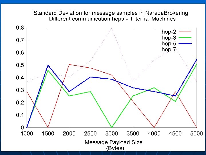 Transit Delay (Milliseconds) Mean transit delay for message samples in Narada. Brokering: Different communication hops 9 8 7 6 5 4 3 2 1 0 hop-2 hop-3 hop-5 hop-7 1000 Message Payload Size (Bytes) Pentium-3, 1 GHz, 256 MB RAM 100 Mbps LAN JRE 1. 3 Linux