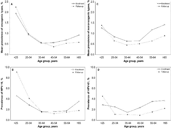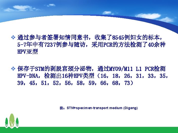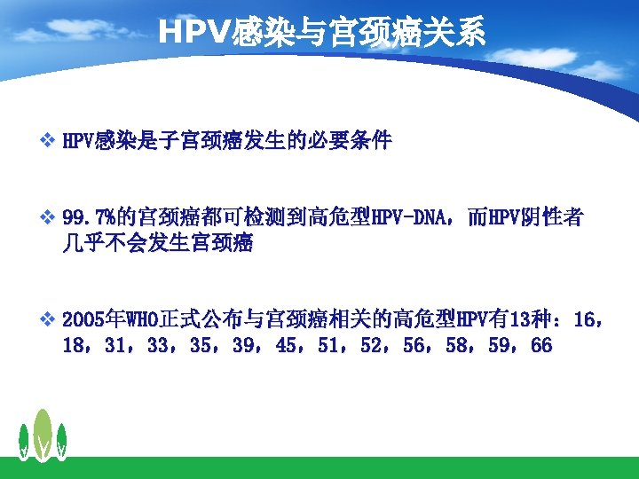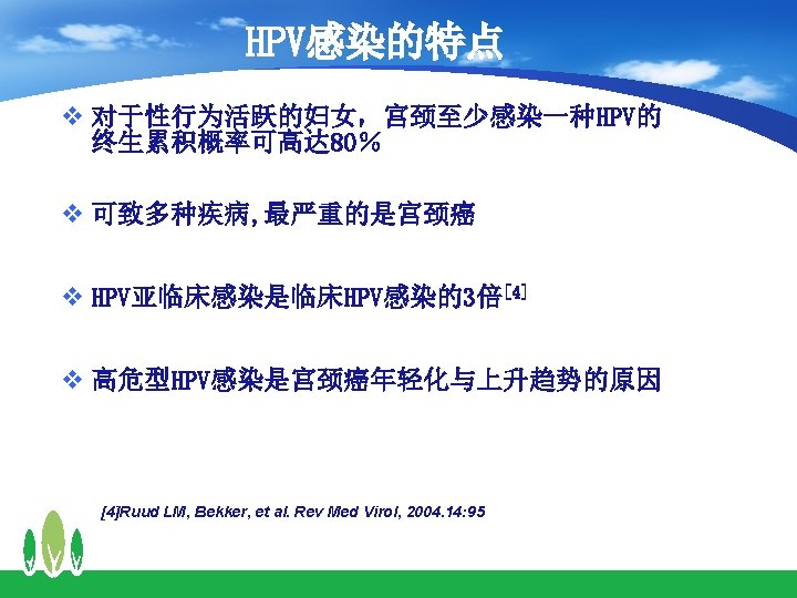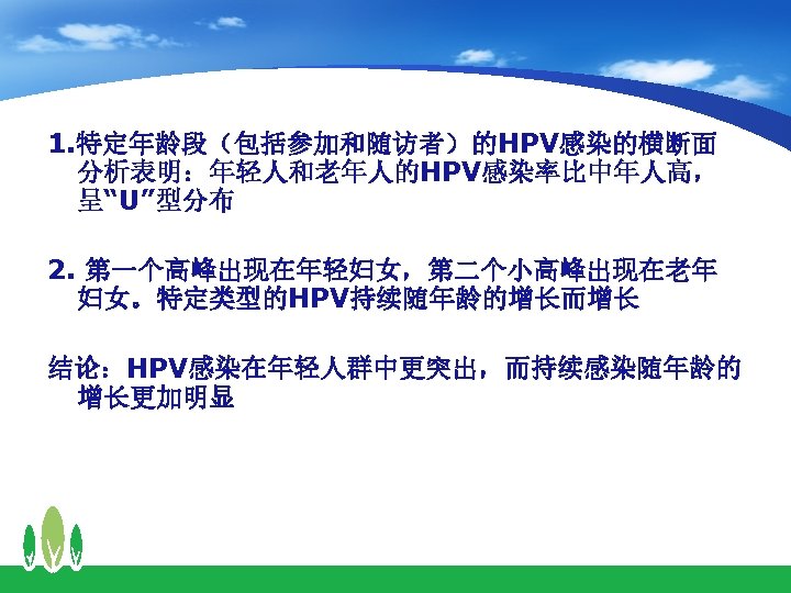 HPV感染及持续与年龄的关系 v 前期的研究发现,年轻人HPV-DNA的表达出现一个高峰, 提示HPV可通过性传播获得其一过性感染。并且也证实: 在 年纪相对较大的妇女中HPV-DNA的表达出现第二个高峰 v Philip E. Castle等人在 1997 -2004年间研究了宫颈癌高 发地区-Guanacaste,Costa Rica 的HPV 感染及持续与年 龄分布的关系[6] [6]Philip E. Castle, Mark Schiffman, Rolando Herrero, et al. A Prospective Study of Age Trends in Cervical Human Papillomavirus Acquisition and Persistence in Guanacaste, Costa Rica. The Journal of Infectious Diseases. 2005; 191(11): 1808 -16