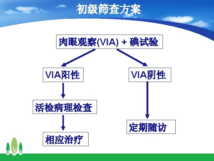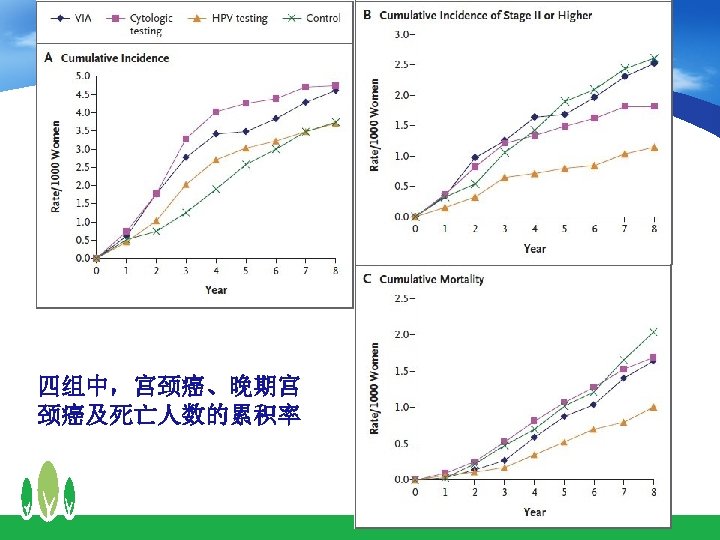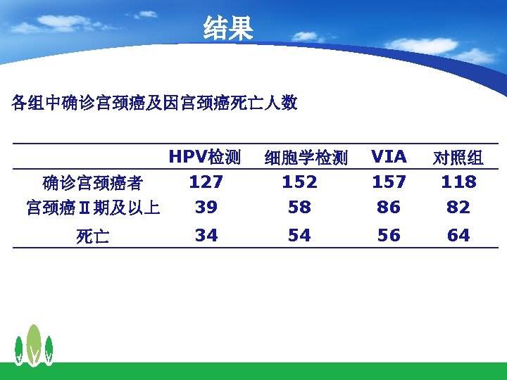 印度农村宫颈癌筛查 2000年 1月-2003年 4月,Rengaswamy等人在印度 农村展开了一次大规模宫颈癌筛查[7] 对象: 52个村庄共计 131, 746名30~59岁妇女 分为四组:HPV检测组(34126人) 细胞学检测组(32058人) VIA检测组(34074人) 对照组(31488人) [7]Rengaswamy Sankaranarayanan, Bhagwan M. Nene, HPV Screening for Cervical Cancer in Rural India, The new england journal of medicine, april 2, 2009