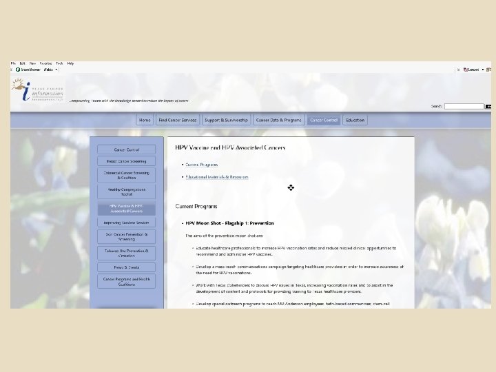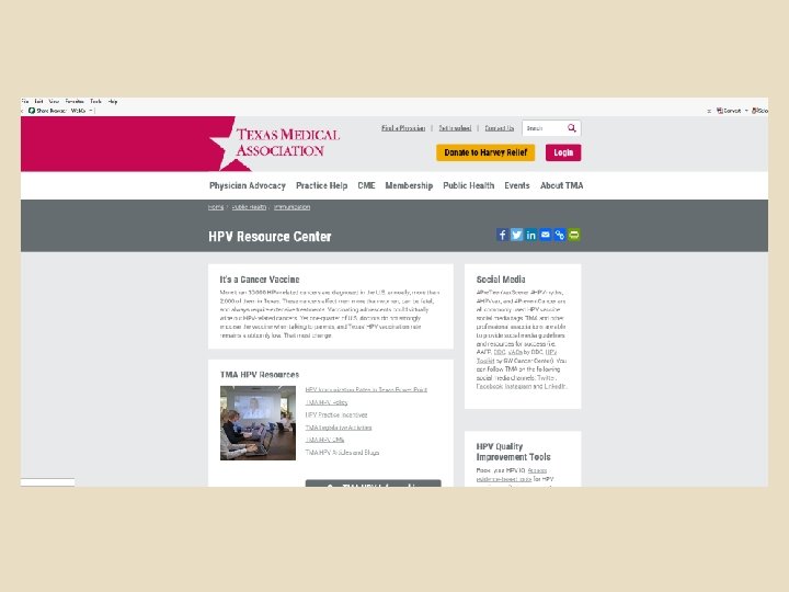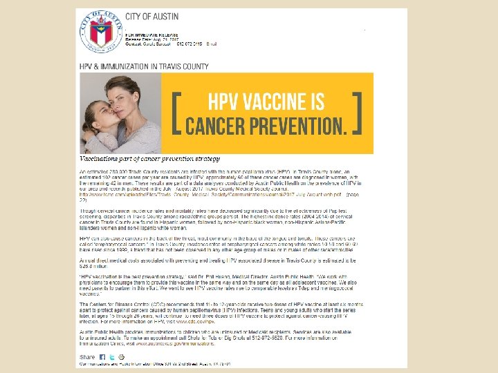 State and Local Efforts to Promote HPV • Texas HPV Coalition: http: //www. texascancer. info/hpv/ • Texas Medical Association https: //www. texmed. org/HPV/ • Cancer Alliance of Texas http: //cancerallianceoftexas. org q. Texas Department of State Health Services https: //www. dshs. texas. gov/hivstd/info/hpv/