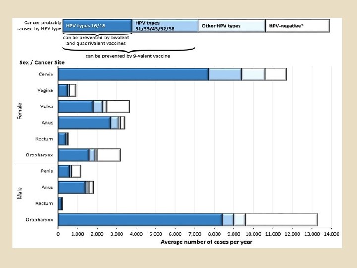 Number of HPV-Associated and HPV-Attributable Cancer Cases per Year Average number of cancers per year in sites where Cancer site HPV is often found (HPVassociated cancers) % probably caused by any HPV type Number probably caused by any HPV type TOTAL 79% 31, 500 39, 844 % probably caused by HPV types 16/18 63% Number probably caused by HPV types 16/18 25, 300 % probably caused by HPV types 31/33/45/ 52/58 10% Number probably caused by HPV types 31/33/45/ 52/58 3, 800
