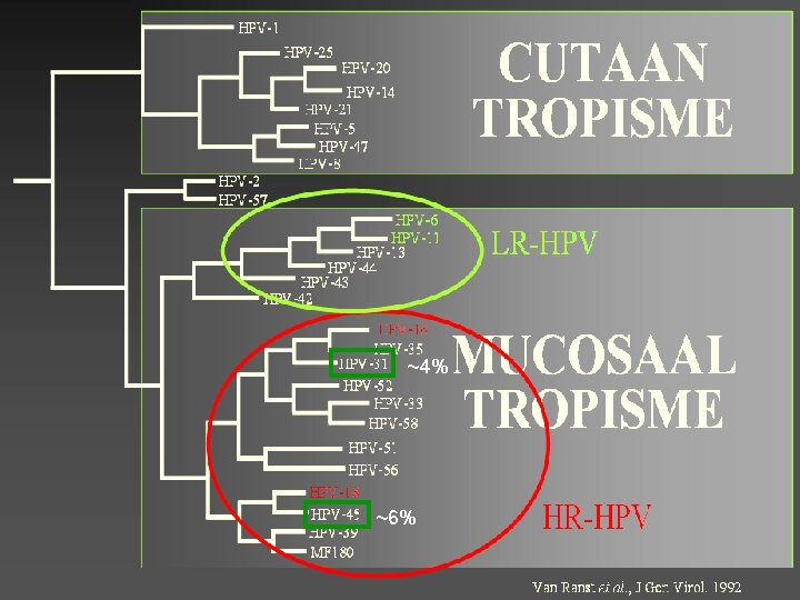 HPV-bepaling & Vaccinatie • Doel HPV-test in het kader van vaccinatie tegen HPV – meisjes/vrouwen identificeren die nog niet in contact geweest zijn met HPV types aanwezig in het vaccin • Verloop Natuurlijke HPV-infectie – Virus slechts tijdelijk aanwezig/aantoonbaar – HPV infectie aantoonbaar maar frequent voor ander types dan deze van het vaccin (Lancet 2005) – Seksueel debuut staat niet onmiddellijk gelijk aan verwerven van HPV infectie, laat staan van HPV infectie met de vaccintypes (doch risico stijgt met leeftijd, aantal partners…) – HPV-DNA test identificeert enkel actieve infectie, geen eerder contact – HPV-DNA type-specifiek test is niet kosteloos – Serologische HPV-test is weinig betrouwbaar en niet commercieel beschikbaar; voorlopig enkel gebruikt in studieverband