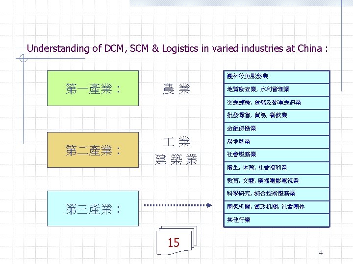 What is the meaning of logistics market ? The formation of logistics market & covering what ? 1. Market – founding, explore & develop, relationship, position & rank, linkage, DNA, components & elements, stage ……… 2. Capacity – index, standard, identity, (goods, industries, 3. 4. 5. 6. 7. consuming) ; demand change, supply volume & trend ……… Structure – demand & supply ……. . Policy – present, future ( maintain, restructuring, innovation ) …. . Operation – positioning, standard, workflow, details ………. Outsourcing – standard, definition, tender ………… Sales & marketing – product & service, specific, win ( single, win, total ) networking, supporting …………. 8. Or even more …………………………. 3