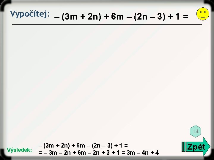 Vypočítej: (14 b + 7) – (9 – 4 b) = 12 Výsledek: (14 b + 7) – (9 – 4 b) = 14 b + 7 – 9 + 4 b = 18 b – 2 Zpět